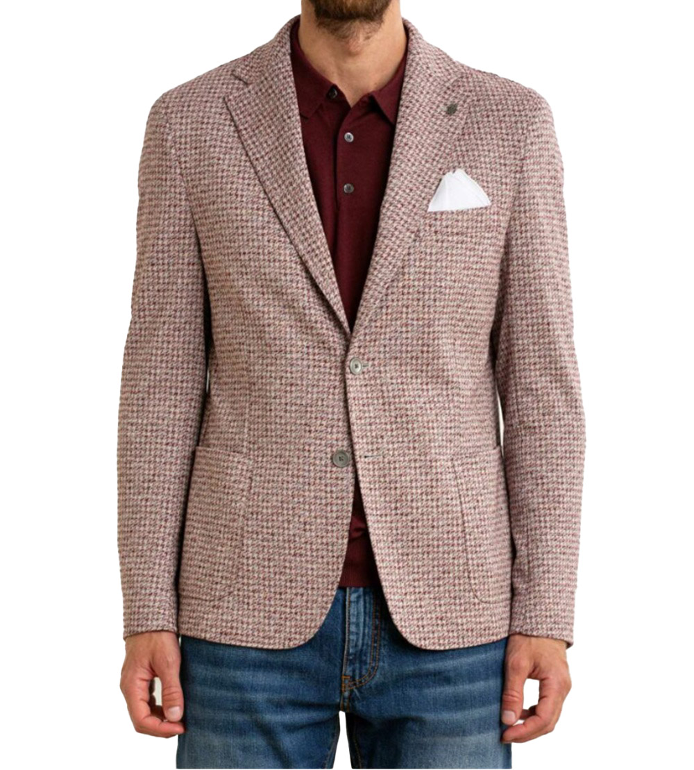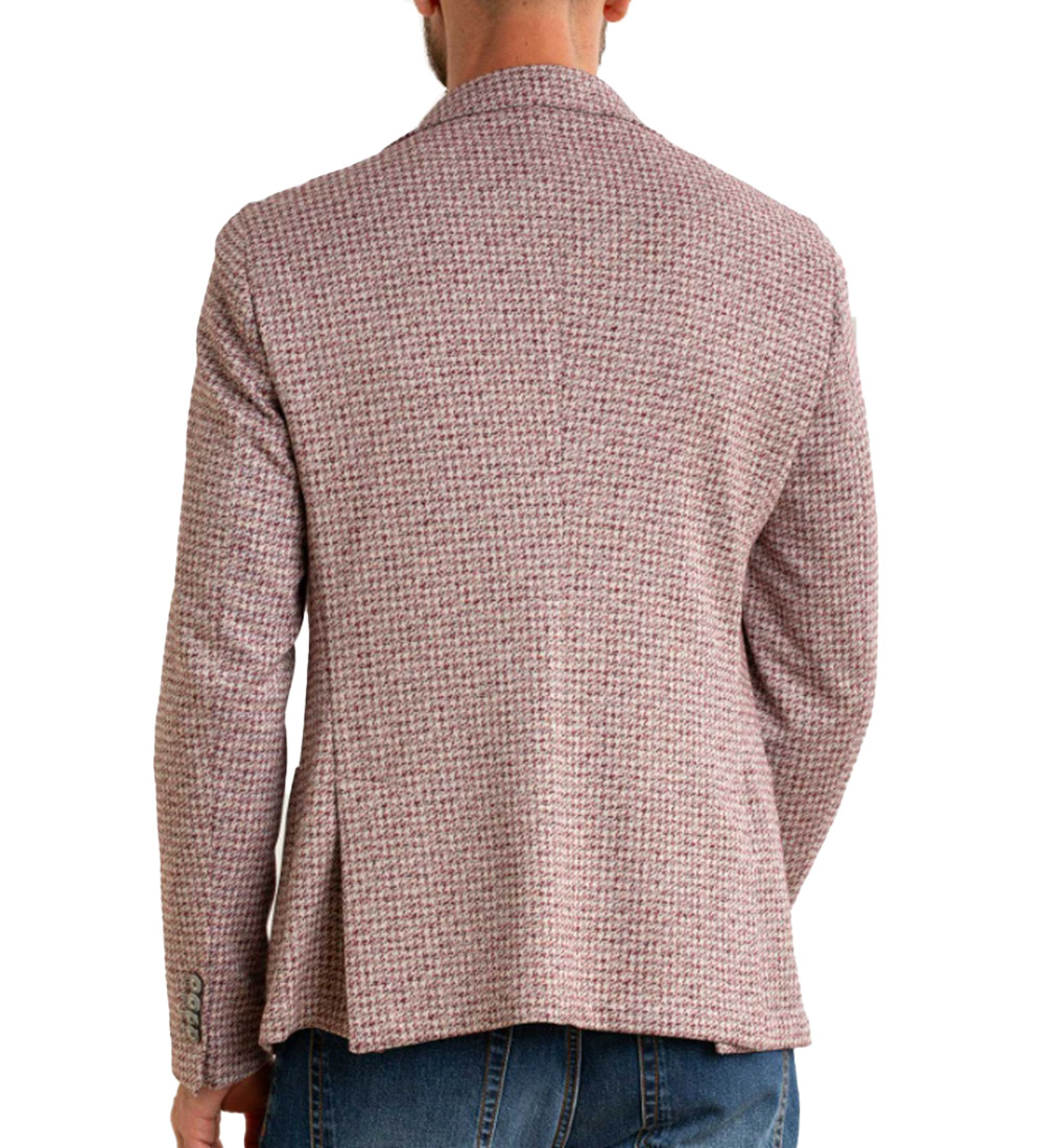 Giacca Daniele Alessandrini da uomo, realizzata in un pregiato tessuto lavorato a micro pied de poule nei toni del bordeaux e beige.