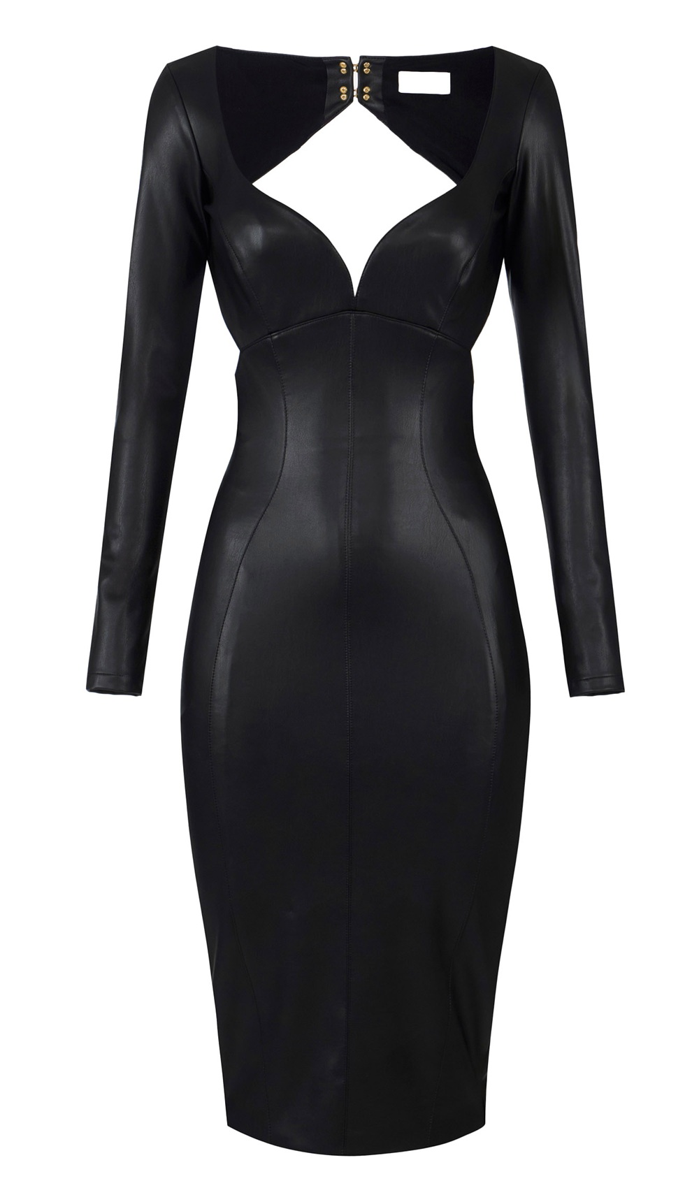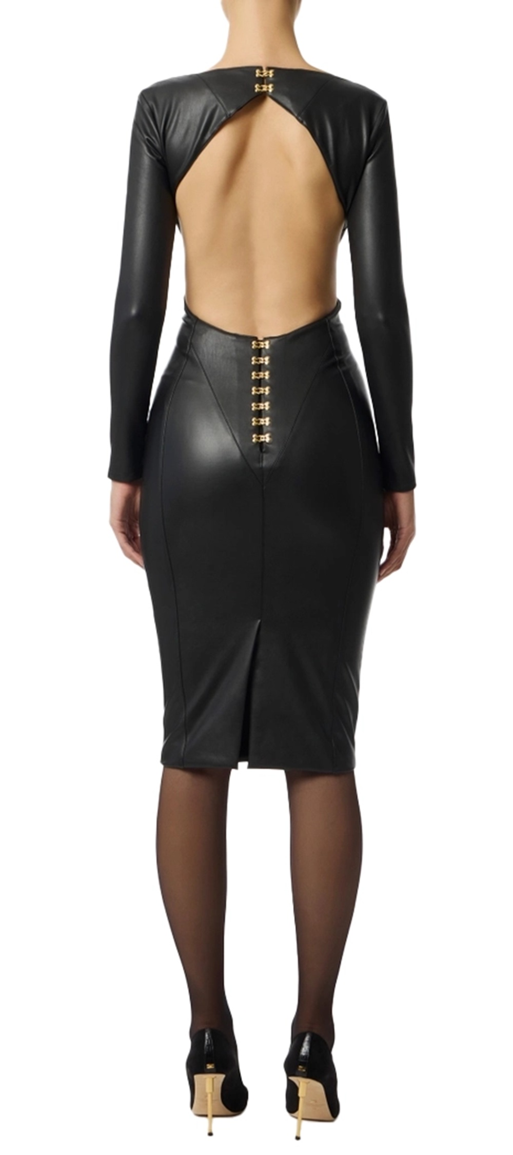 Realizzato in materiale sintetico effetto nappa, questo abito aderente con maniche lunghe si distingue per tagli cut-out laterali ai fianchi e una schiena con oblò definito da ganci in metallo dorato.