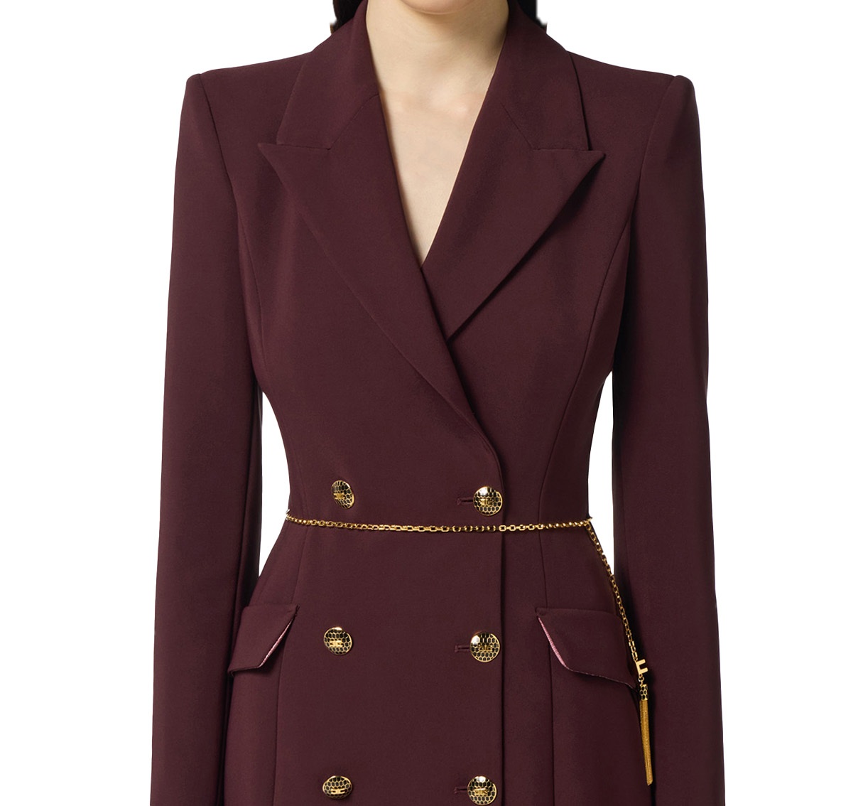 I dettagli preziosi come i bottoni e la cintura in catena con logo e nappina in trama snake aggiungono movimento e luce.
