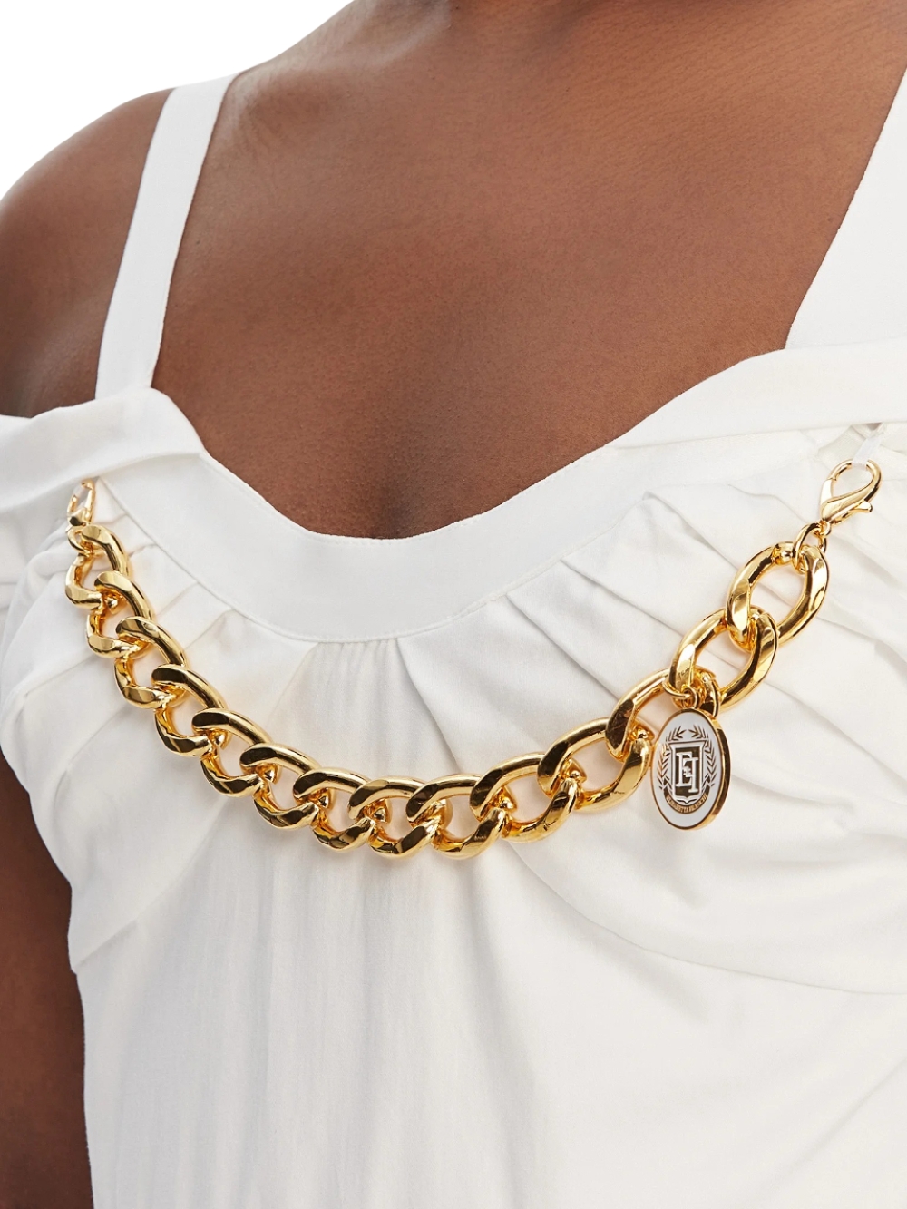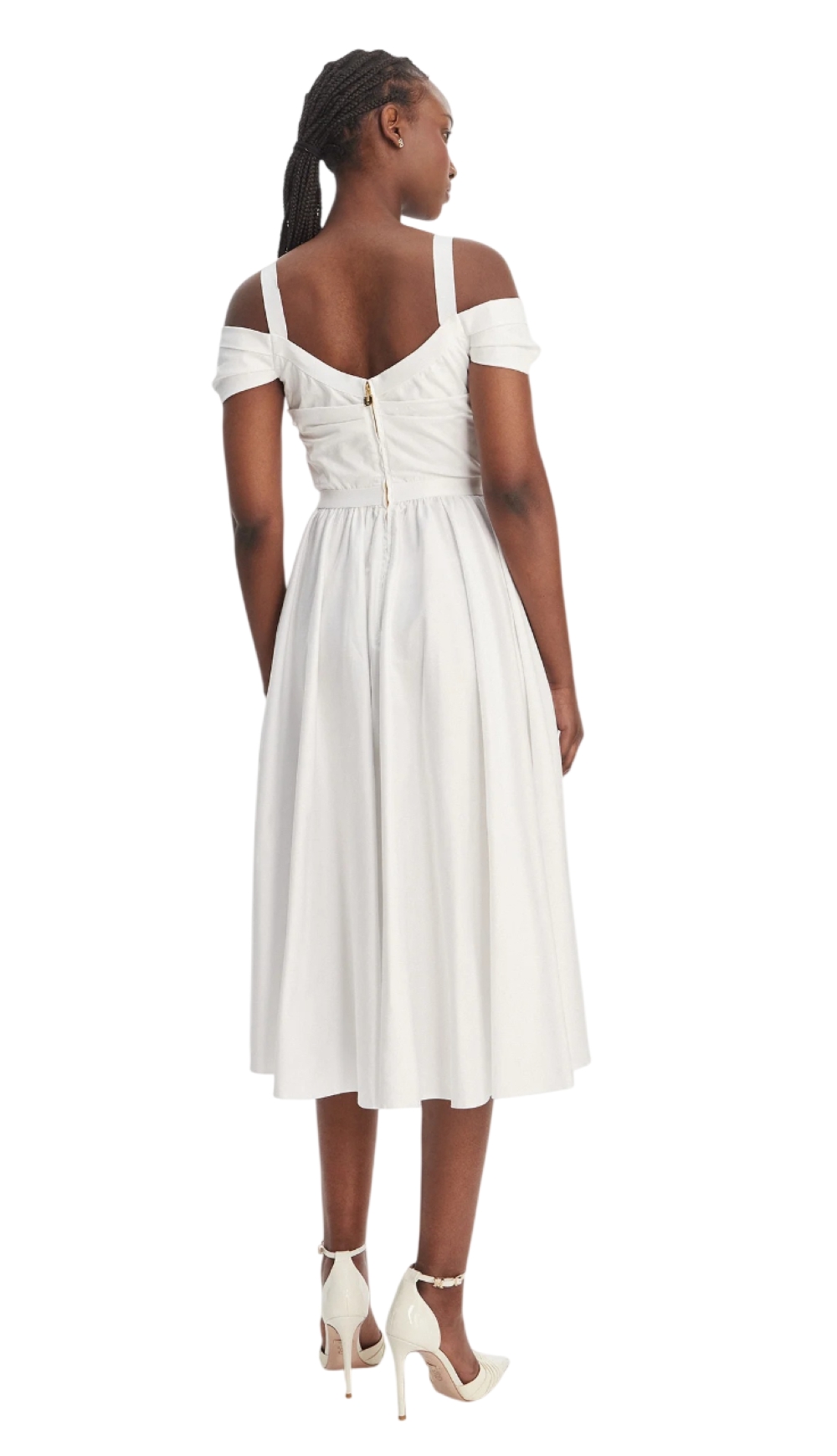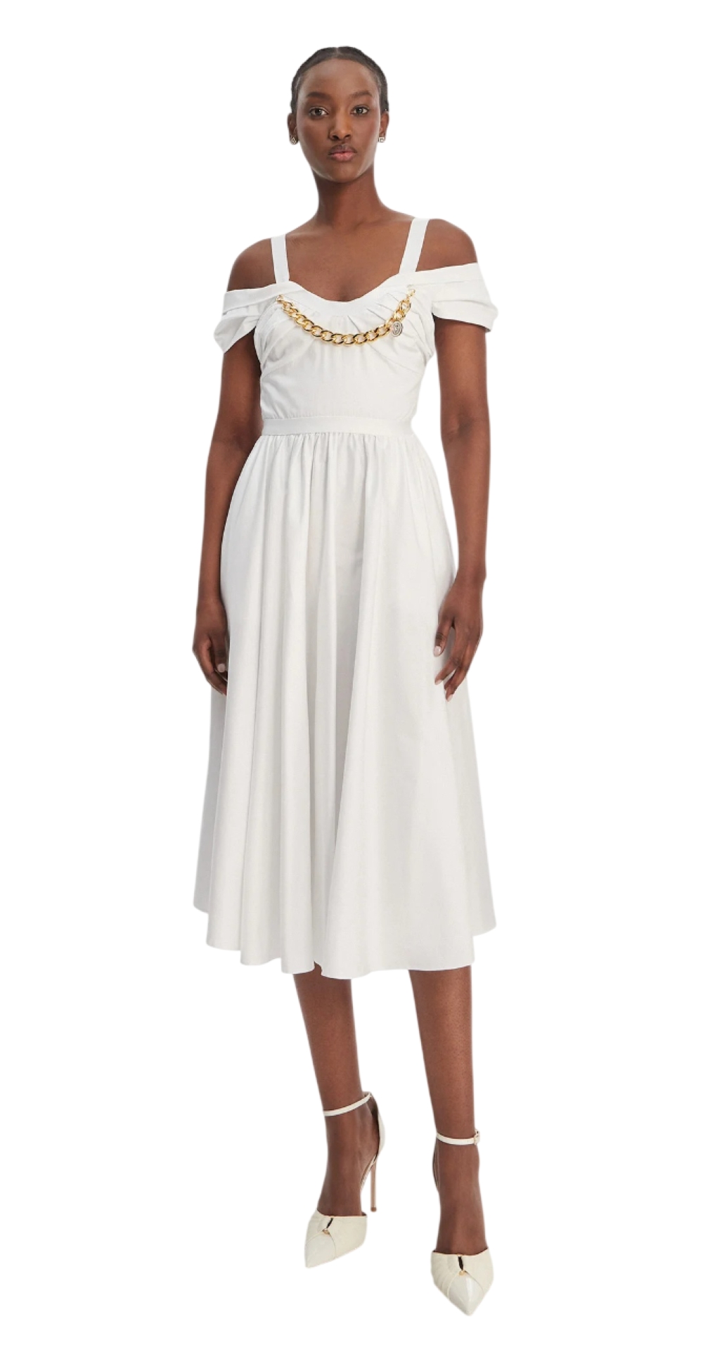 Abito in cotone stretch dalla vestibilità regular. Il vestito ha spalline, maniche corte e si distingue per l'ampia gonna a ruota che aggiunge movimento alla sua silhouette raffinata. Un dettaglio di luce con la collana in metallo dorato, posizionata sullo scollo e amovibile. Lunghezza 120 cm per la taglia 40 IT