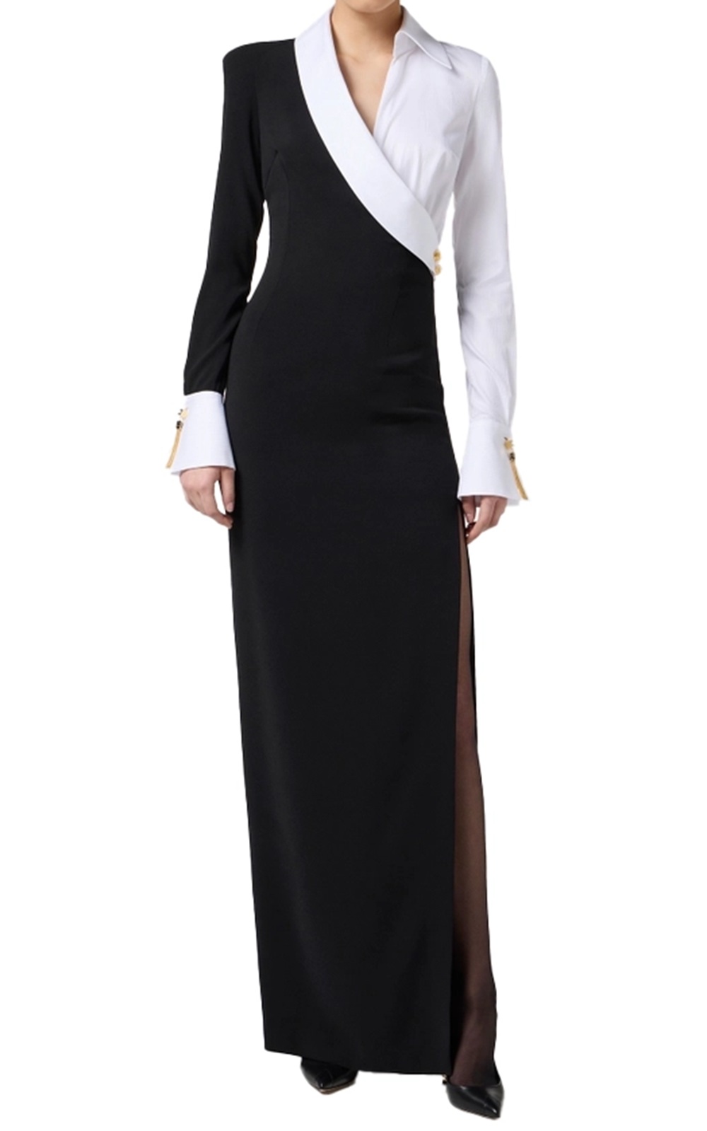 Il vestito ha spalle strutturate e si distingue per il collo a camicia e la manica in popeline di cotone, a creare uno studiato contrasto.