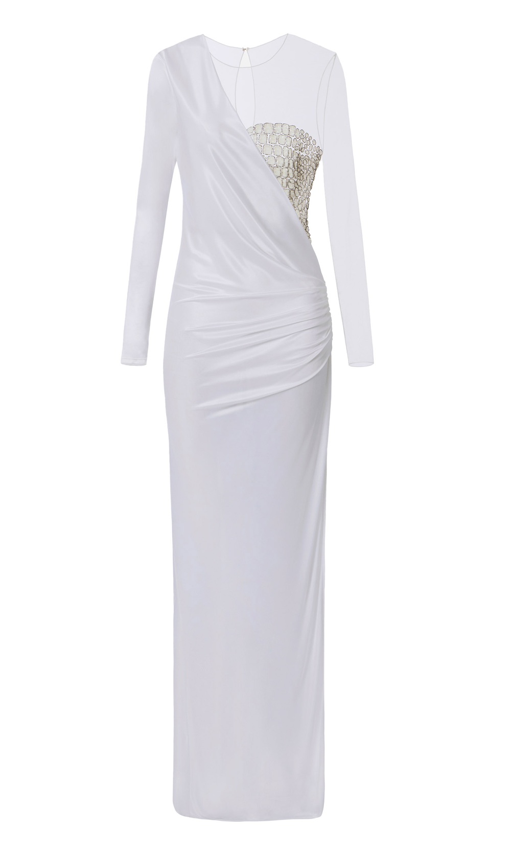 La costruzione in jersey di viscosa lucida fluisce in un drappeggio laterale, che si apre in un ampio spacco sulla gonna.