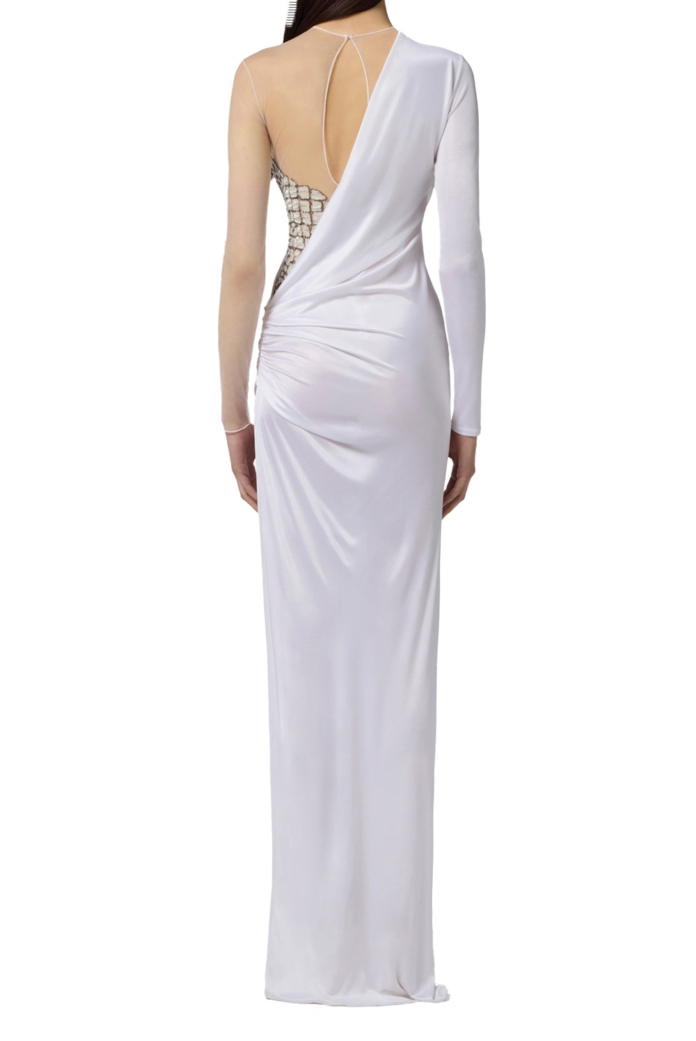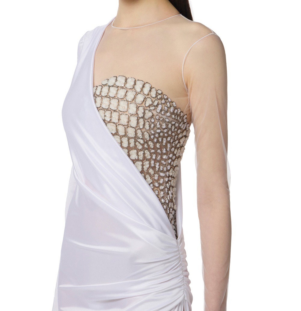 Abito da sera asimmetrico e dalla vestibilità aderente.