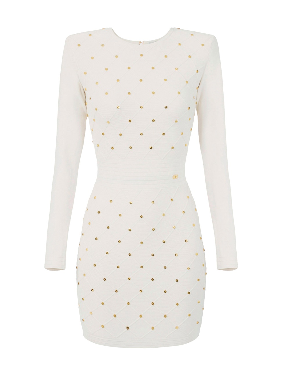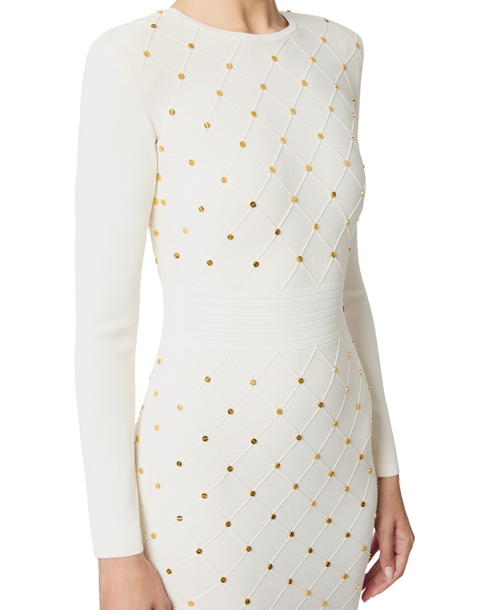 Il vestito ha spalle strutturate, girocollo e maniche lunghe.