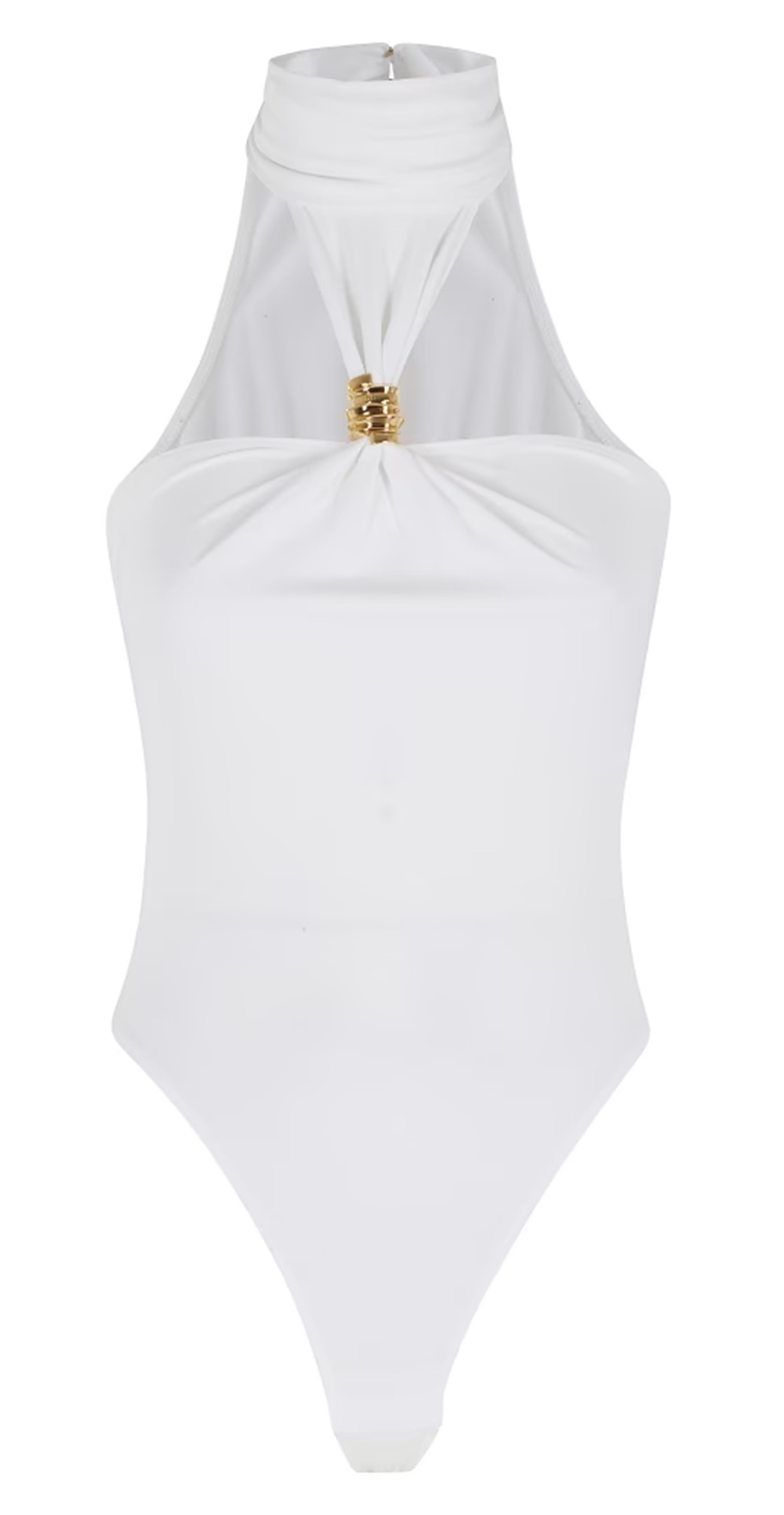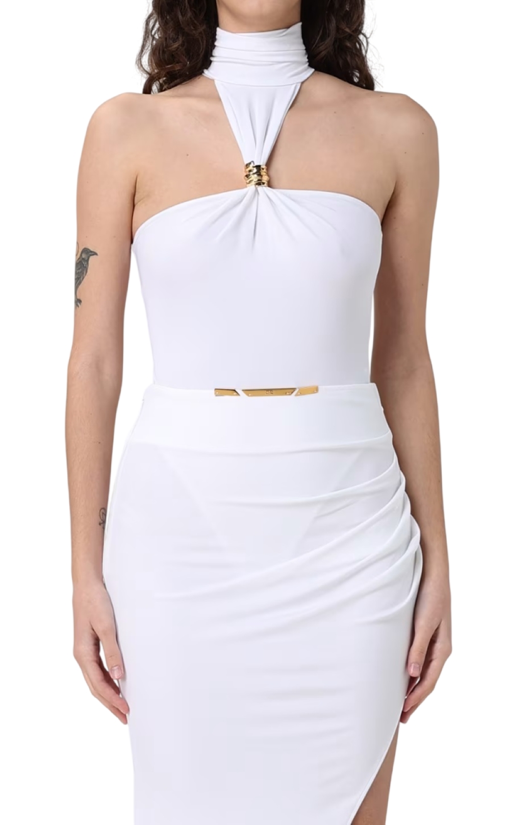 Body in jersey crêpe con collo alto ed è impreziosito dall'accessorio gioiello in metallo dorato che trattiene lo scollo. Vestibilità aderente.