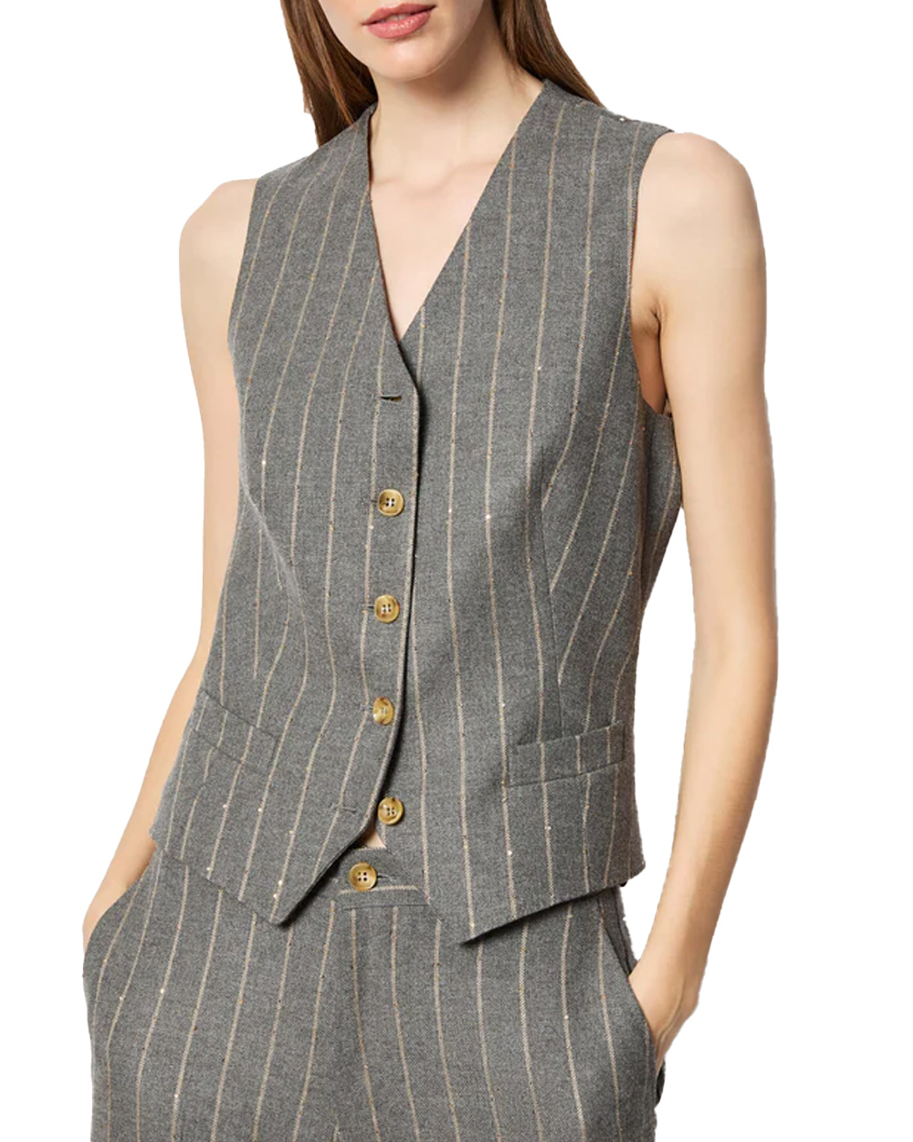 Con una fantasia gessata su base grigio fumo melange arricchita da sottili righe in beige lurex, questo gilet assicura un tocco di luce discreta e sofisticata. Perfetto da indossare sopra una camicia o in abbinato al blazer coordinato, è ideale per look formali e smart-casual.