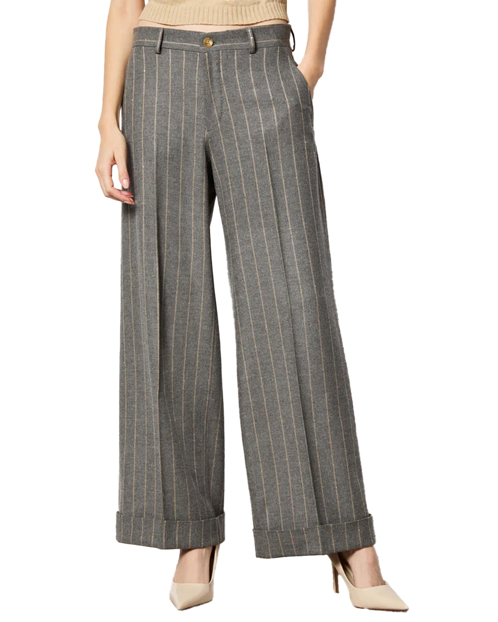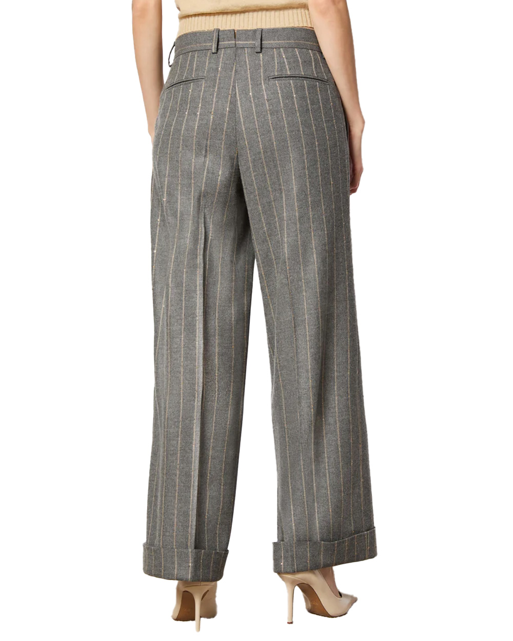 Pantalone L.B.M 1911 donna 811253543 Grigio fantasia gessata su base grigio fumo melange linea sottile in beige lurex modello palazzo con gamba ampia e dritta