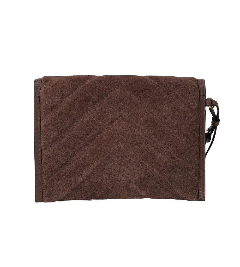 Bustina realizzata in pelle scamosciata con dettagli in pelle e motivo chevron, dotata di fodera in cotone. Caratterizzata dalla tracolla a catena rimovibile lunga 54 cm, la borsetta risulta estremamente versatile e pratica. Il design viene completato dall'iconico Love Birds, in galvanica resistente, che si fa portavoce dell'inimitabile stile del brand.