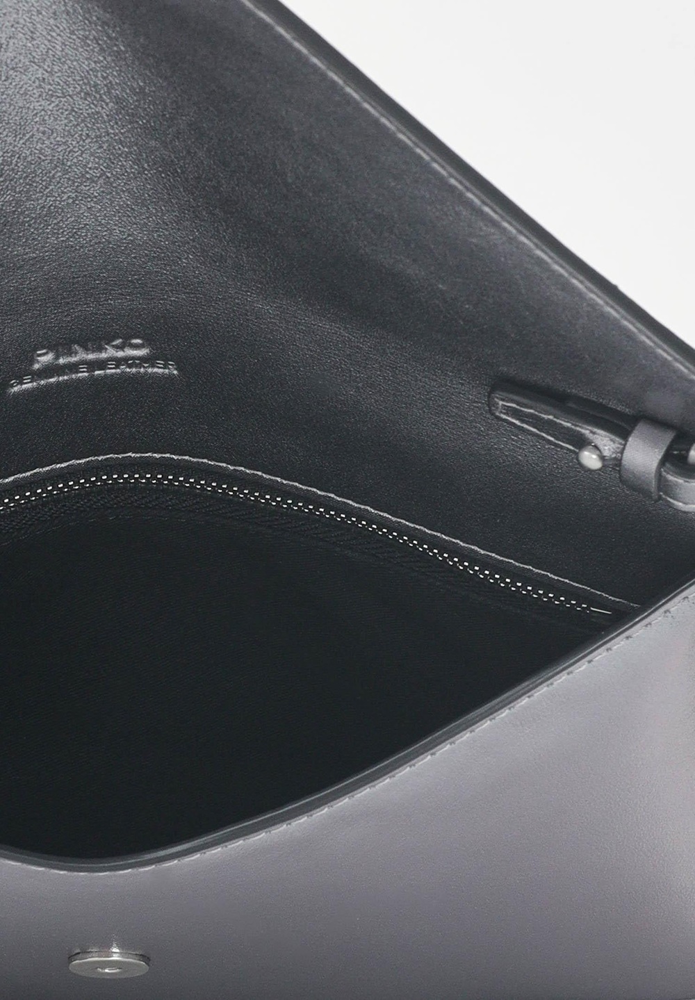 L'interno, foderato in tessuto nero, è dotato di una pratica tasca piatta e riporta l'incisione "Pinko - Genuine Leather".