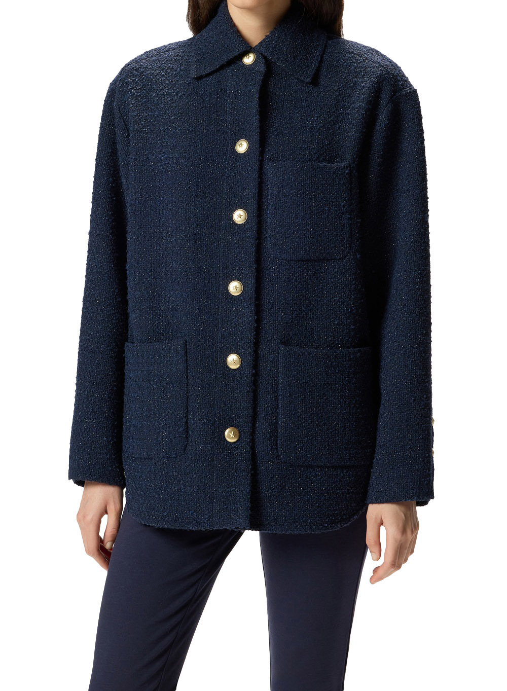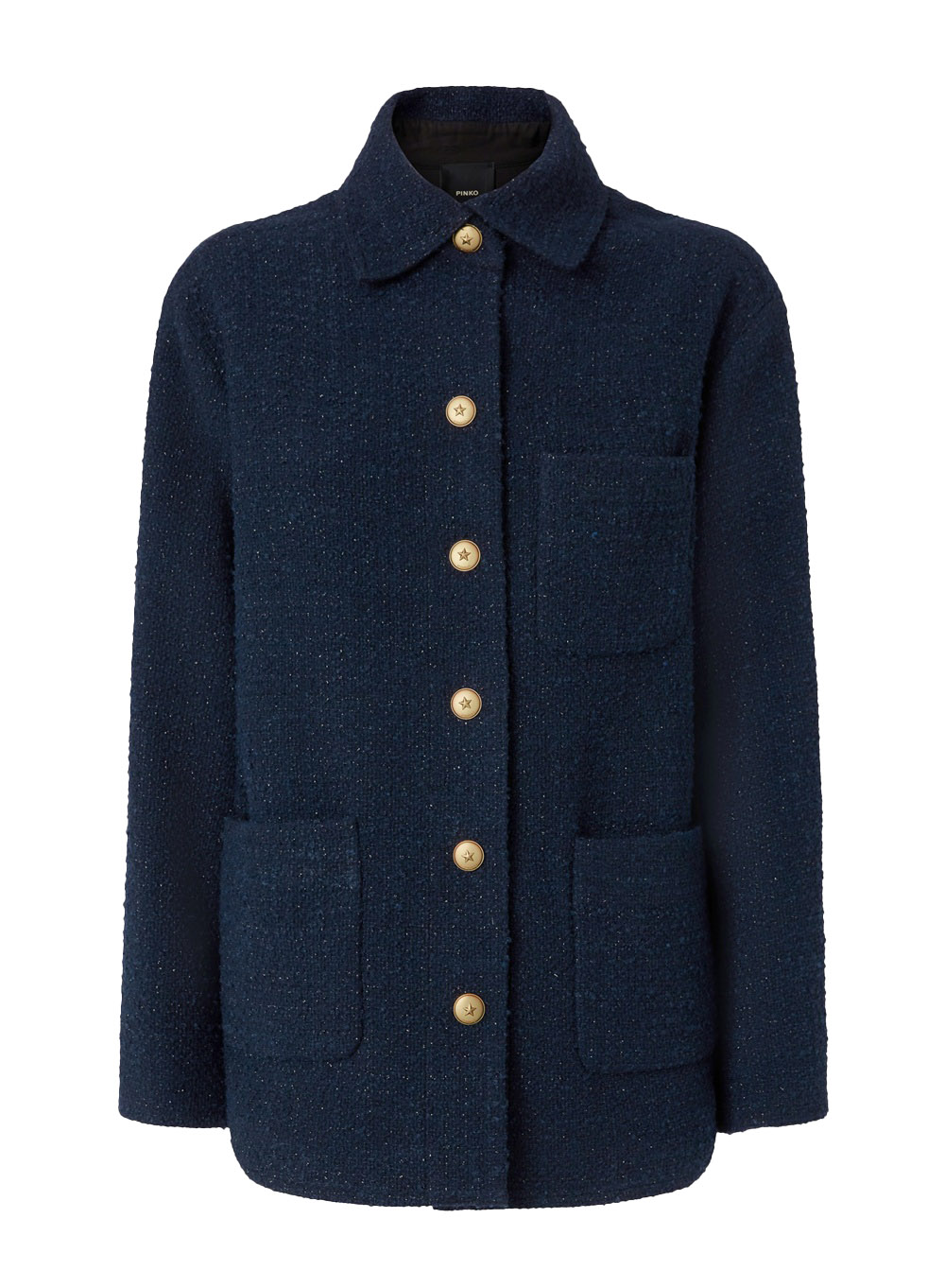 Giacca oversize in tweed accoppiato con colletto classico e chiusura sul davanti con bottoni in metallo decorati da stella.